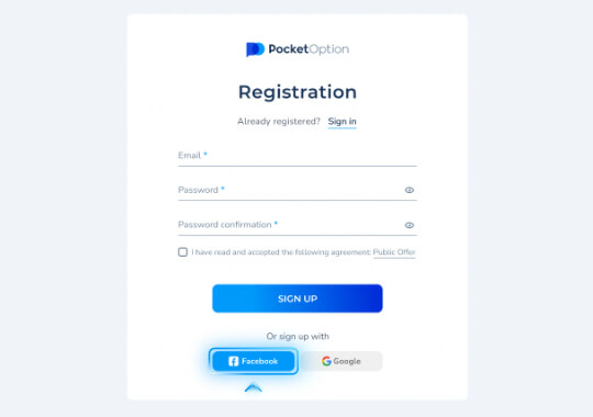 Select the most comfortable option and proceed with your account registration. Please note, that if you sign up via Facebook or Google you may need to reset your password here in order to login to your Pocket Option account by using email and password instead.